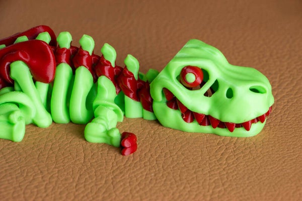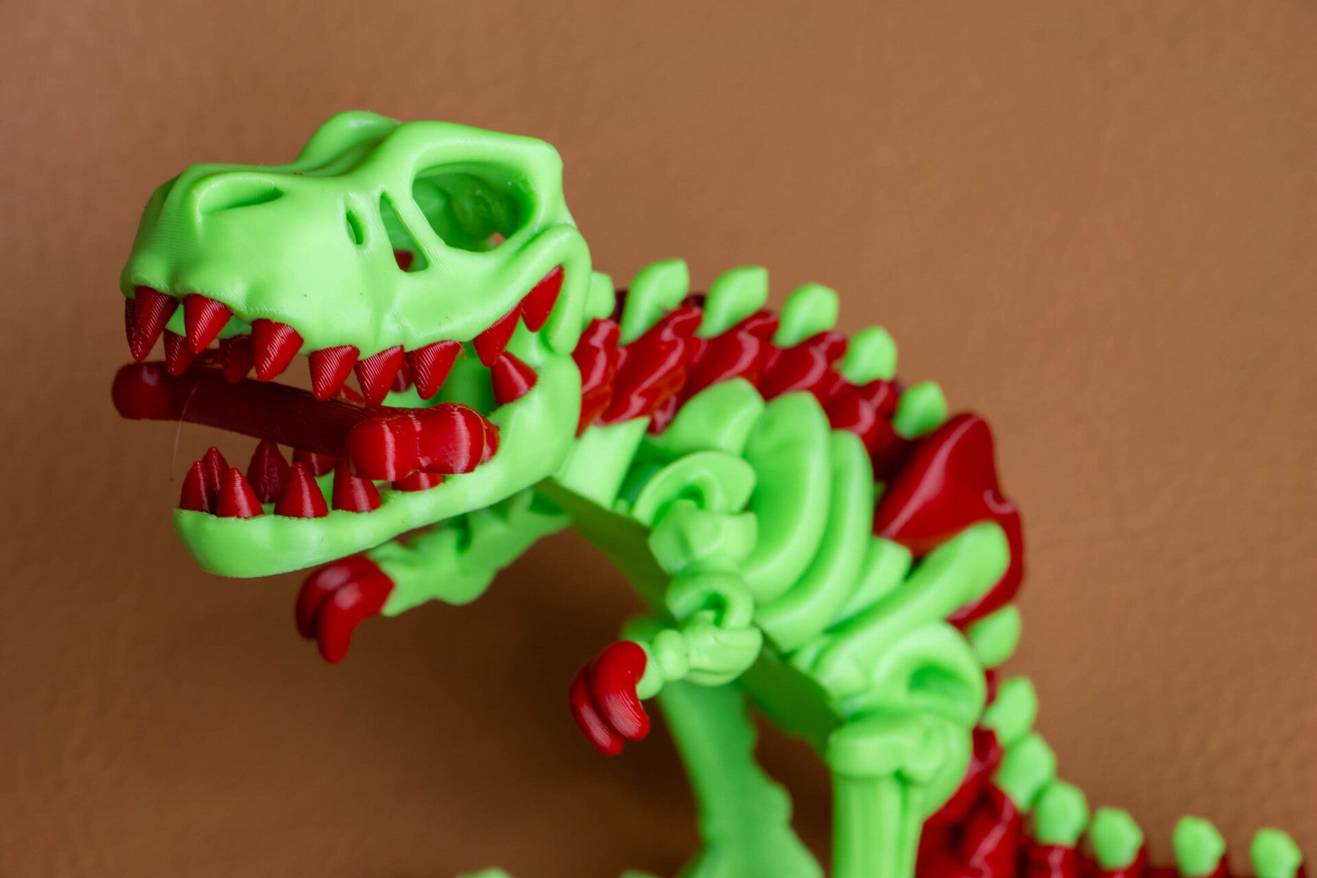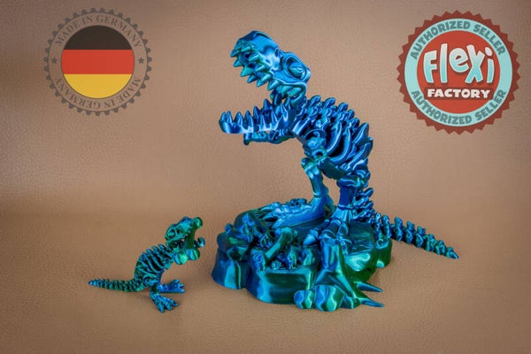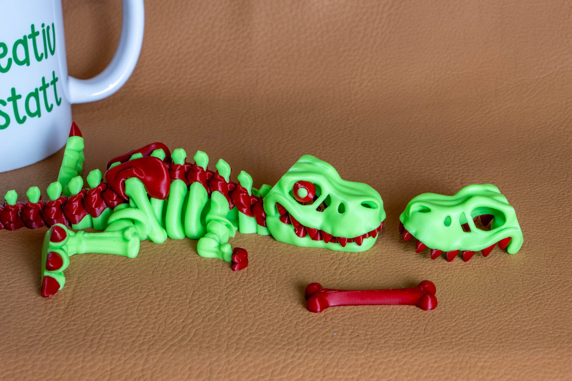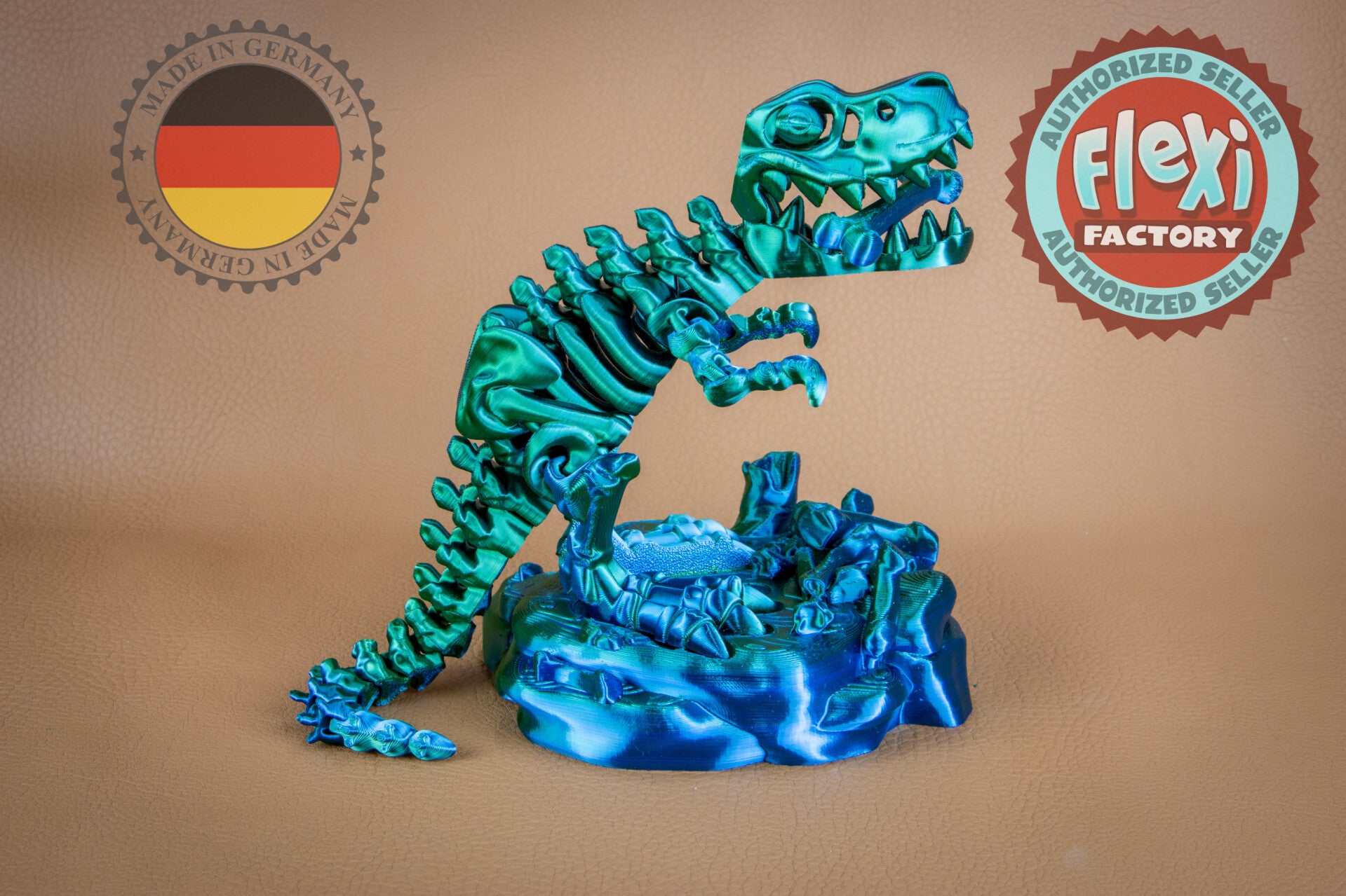 Wir präsentieren stolz unseren T-Rex Dinosaurier von Flexi-Factory – eine beeindruckende 3D-gedruckte Kreation mit Ständer und zusätzlichen Knochen.